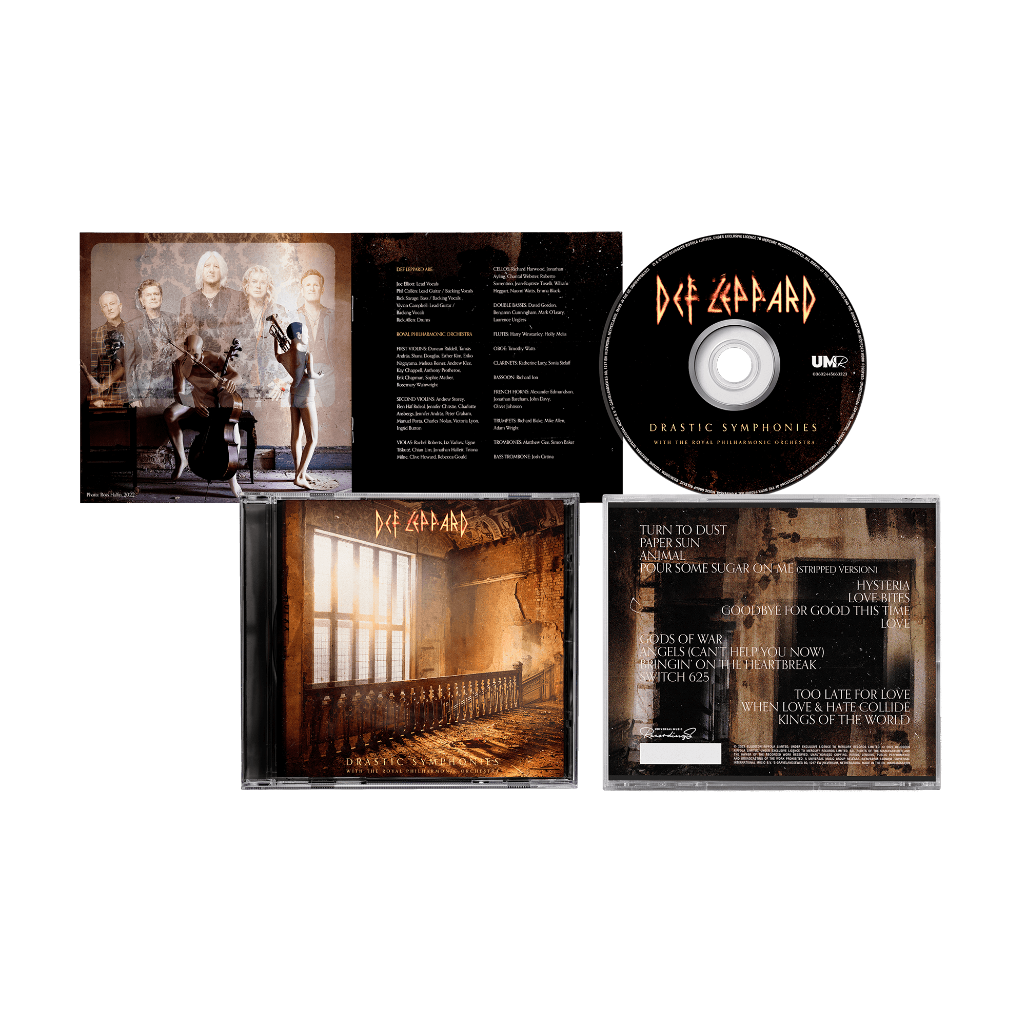 Strap yourselves in for the sonic ride of your life. Rock and classical royalty unite on brand new album Drastic Symphonies. Recorded at Abbey Road Studios in London, Def Leppard have drastically deconstructed and reimagined some of their biggest hits, collaborating with the Royal Philharmonic Orchestra. This bold new approach to the orchestral hits formula sees new vocal and guitar recordings from the band. Available in a 1CD jewel case package.